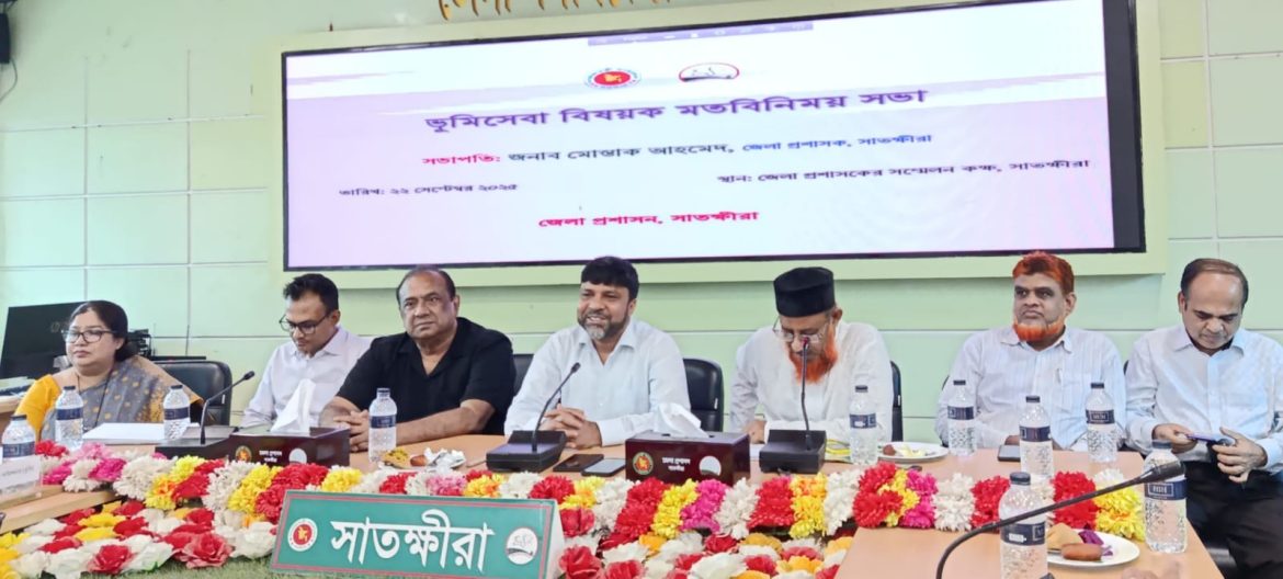 মীর আবু বকরঃ সাতক্ষীরায় ভূমসেবা বিষয়ক মতবিনিময় সভা অনুষ্ঠিত হয়েছে। জেলা প্রশাসনের আয়োজনে সোমবার সকাল সাড়ে ১০ টায় জেলা প্রশাসকের আয়োজনে জেলা প্রশাসক মোস্তাক আহমেদের সভাপতিত্বে বক্তব্য রাখেন, জেলা বিএনপির আহ্বায়ক রহমাতুল্লাহ পলাশ,জেলা জামায়াতের আমির উপাধ্যক্ষ শহিদুল ইসলাম মুকুল, সাতক্ষীরা সরকারি কলেজের অধ্যক্ষ প্রফেসর আবুল হাসেম, মহিলা কলেজ অধ্যক্ষ প্রফেসর বাসুদেব বসু, সরকারি কৌঁসুলি এড অসিম কুমার মন্ডল,অতিরিক্ত পুলিশ সুপার ডিএসবি মিথুন সরকার, জেলা প্রাথমিক শিক্ষা অফিসার মোঃ রুহুল আমিন, জেলা রেজিস্ট্রার হাফিজা খাতুন, বৈষম্য বিরোধী ছাত্র আন্দোলনের নেত্রী মোহিনী তাবাসসুম প্রমুখ। সভায় বক্তারা ভূমি সেবা নিয়ে বিভিন্ন সমস্যার কথা তুলে ধরেন। সমাপনী বক্তব্যে জেলা প্রশাসক বলেন, রাষ্ট্রের সবচেয়ে গুরুত্বপূর্ণ বিষয় ভূমি। ভৃমিসেবার সাথে সংশ্লিষ্ট সকলকে আন্তরিকতার সাথে কাজ করতে হবে। কোন নাগরিক যেন ভূমিসেবা পেতে হয়রানির শিকার না হয়। রাষ্ট্রের উচ্চ স্তর থেকে শুরু করে কৃষক, শ্রমিক, দিনমজুর সকলেই ভূমির সাথে সংশ্ল