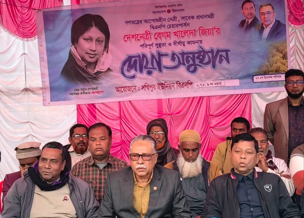 স্টাফ রিপোর্টারঃ গণতন্ত্রের আপোসহীন নেত্রী বিএনপির চেয়ারপারসন সাবেক ৩ বারের প্রধানমন্ত্রী দেশনেত্রী বেগম খালেদা জিয়ার সুস্থতা কামনায় দোয়া মাহফিল অনুষ্ঠিত হয়েছে।দেবহাটা উপজেলা সখিপুর ইউনিয়ন বিএনপির আয়োজনে দোয়া মাহফিলে প্রধান অতিথি হিসেবে উপস্থিত ছিলেন সাতক্ষীরা (সদর-দেবহাটা) ২আসনের ধানের শীষ মনোনীত প্রার্থী মনোনীত প্রার্থী আলহাজ্ব আব্দুর রউফ। বক্তব্য রাখেন বিএনপি নেতা চেয়ারম্যান গোলাম ফারুক বাবু,বিএনপি নেতা মোখলেছুর রহমান মুকুল, বিএনপি নেতা এবাদুল ইসলাম সহ বিএনপির ও সকল অঙ্গ সহযোগী সংগঠনের নেতৃবৃন্দ উপস্থিত ছিলেন।